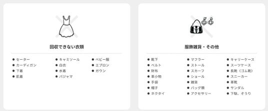 ・衣料品の大量持ち込みなど、本プロジェクトの企画趣旨と著しく異なると当社が判断した場合は、引き取りをお断りさせていただく場合がございます。