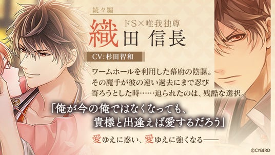 また、配信開始日よりお楽しみいただける長編ストーリーして、新章「第三幕」の物語となる織田信長(CV:杉田智和)続々編、霧隠才蔵(CV:小林千晃)本編、千利休(CV:堂島颯人)本編と、『イケメン戦国』からの移植となる織田信長本編/続編、伊達政宗・上杉謙信の本編の配信も決定しました。