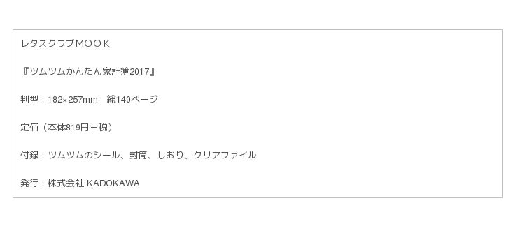 株式会社KADOKAWA(本社:東京都千代田区、代表取締役社長:松原眞樹)は『ツムツムかんたん家計簿2017』を発売しました。