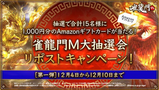 雀龍門MのX公式アカウント( https://x.com/Janryumon_M )にポストされる当キャンペーンの対象ポストをリポストしていただいた方の中から、各応募期間につき抽選で5名様、総計15名様にAmazonギフトカード 1,000円分をプレゼントします。