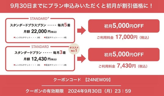 2024年9月1日(日)~2024年9月30日(月)の期間中にクーポンコードをご入力の上、新規でプランにお申込みいただくと、初月のご利用料金が割引されます。