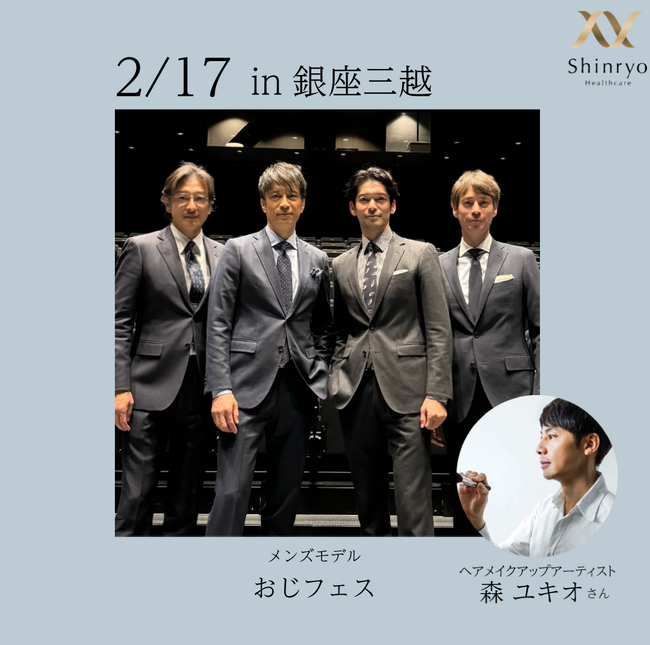 水素ゼリーを5,400円(税込)以上お買いあげのお客さま限定で、2月17日(土)に今大人気の格好いいルックスでコミカルなダンスを踊るメンズモデル“おじフェス(仮)”(直樹さん、加藤章太郎さん、TAROさん、久保田裕之さん)の皆さんとの写真撮影を行います。また、メイクアップアーティストの森ユキオさんも来場。商品についてご案内させていただきます。