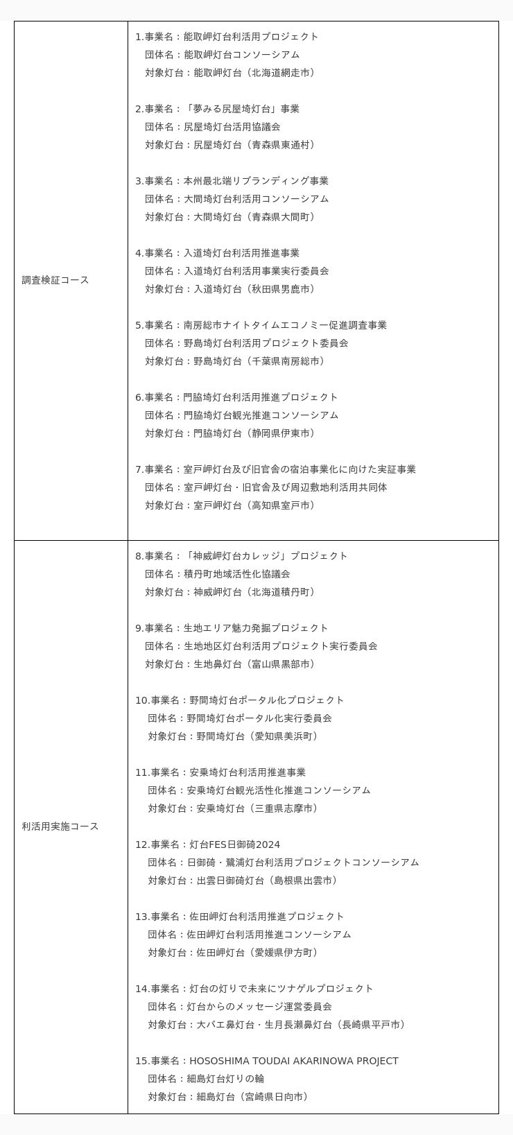 <新たな灯台利活用モデル事業 2024年度採択事業一覧>