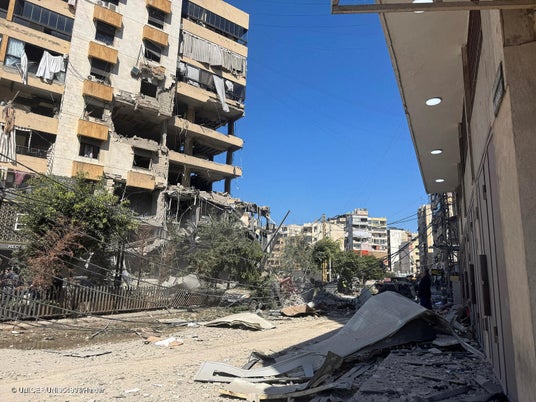 ベイルート南部にある街、ハーレト・フレイクの様子。3月2日に空爆を受け、多くの建物が損傷し、深刻な被害を受けた(レバノン、2026年3月2日撮影) (C) UNICEF/UNI954893/Haidar