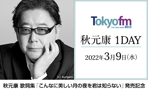 TOKYO FMでは3月9日(水)に、秋元康 歌詞集「こんなに美しい月の夜を君は知らない」発売記念『TOKYO FM 秋元康 1DAY』を実施いたします。午前のワイド番組『Blue Ocean』から深夜の『TOKYO SPEAKEASY』まで6番組に秋元康がゲスト出演。さらに、『Blue Ocean』、『山崎怜奈の誰かに話したかったこと。』『THE TRAD』では、リスナーからの事前に募集したお悩みや相談に秋元康が答える特別企画も実施します。どうぞお楽しみに。