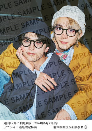 「週刊TVガイド2024年6月21日号」をアニメイト通販で購入すると、特典として駒木根葵汰&新原泰佑の生写真をプレゼント。羽山&白崎が“CM撮影をしたら…”、“プライベートをパパラッチされたら…”といった、“If”のシチュエーションで撮影した美グラビアの中から、2種類のうち1枚を選ぶことができる。ここでしか手に入れられない特典をお見逃しなく!