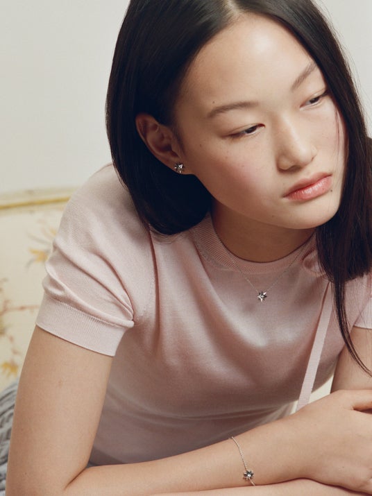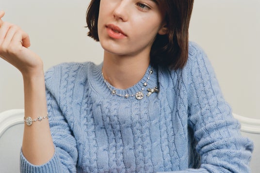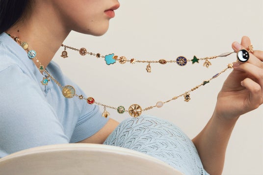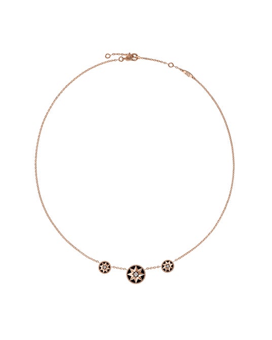 エネルギー、感動、調和を予感させる「ローズ デ ヴァン」のストーリーに新たに加わったのは、強さと静謐さを体現するオニキスをあしらった漆黒のクリエイションがモダンなネックレス、イヤリングとブレスレットです。「エトワール デ ヴァン」からは初となるホワイトゴールド モデルが登場し、ムッシュ ディオールのラッキーナンバーであった「8」へのオマージュである八芒星モチーフが普遍的で、一切の妥協を許さない自由なシルエットを描きます。ピンクゴールド、または、ホワイトゴールドにダイヤモンドをあしらったネックレスとブレスレットは、優美に揺らめく輝きの中で「ローズ デ ヴァン」と「エトワール デ ヴァン」を紡ぎます。そして、ヴィクトワール・ドゥ・カステラーヌも大切にしている、ムッシュ ディオールのラッキーチャームであるスズラン、ハート、バラ、スカル、アイビー、空を舞うハチが、彩り豊かに配されたロングネックレスが登場します。輝きとひとつひとつのチャームが宿す秘められたストーリーが一体となり、運命の神秘を信じたムッシュ ディオールと呼応した現代のタリスマンとして、遊び心に溢れたステートメント ジュエリーです。