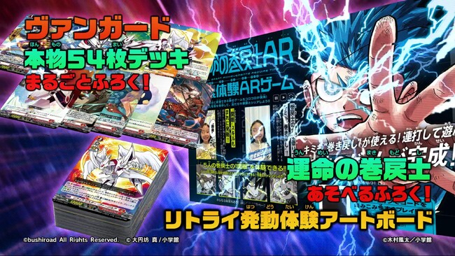 「カードファイト!!ヴァンガード」は本物54枚デッキまるごとふろく! まんがの主人公・ゼロと同じデッキ内容で、即ファイトできるプレイマットもついてくる! 『運命の巻戻士』からは、「運命の巻戻士AR 開眼体験ARゲーム」が遊べるアートボードがふろく! 巻戻士になって “巻き戻し(リトライ)” してみよう!!