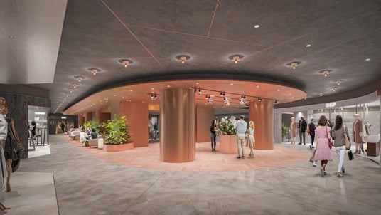 各フロアにメイン素材である「銅」と「真鍮」をエスカレーターを囲む楕円形のスペースに使用することで、館の縦の動線を強調し印象的な体験を生み出します。また、本館3階・4階ではフロアの中心に特徴的なデザインを施し、フロアの賑わいを演出します。
