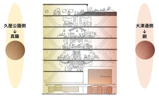 久屋大通側に「真鍮」・大津通側に「銅」をメイン素材として使用するなど、エリアを分けて表現することでお客様が回遊しながらも、自分の居場所を認識しやすい空間を構成します。
