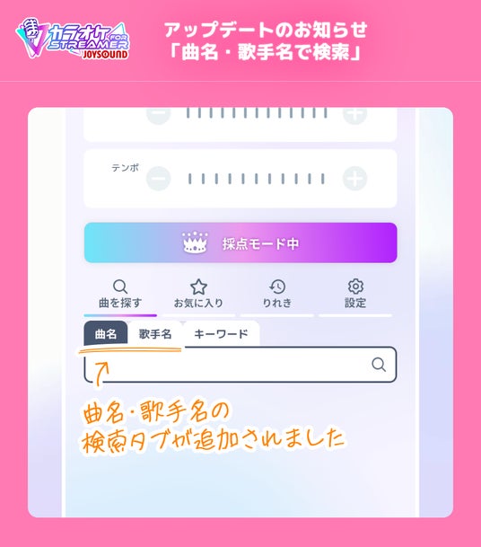 なお、「カラオケJOYSOUND for STREAMER」では、配信者の声に応え、ボーカロイド(TM)楽曲をはじめとした人気ジャンルの楽曲を拡充。これまでに3度にわたる大規模な増曲を実施し、2025年7月時点で搭載楽曲数は約4万曲に達しました。さらに、この7月には、「曲名」や「歌手名」による検索機能を新たに実装し、選曲の利便性も大幅に向上しました。