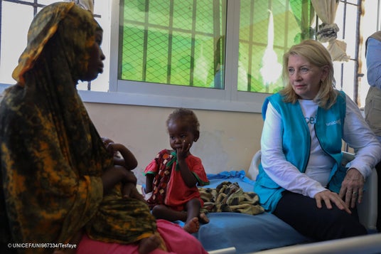 南部ドローの病院で、重度の急性栄養不良と合併症の治療を受けている子どもの母親から話を聞くラッセル事務局長(右)(ソマリア、2026年3月25日撮影)(C) UNICEF/UNI967334/Tesfaye