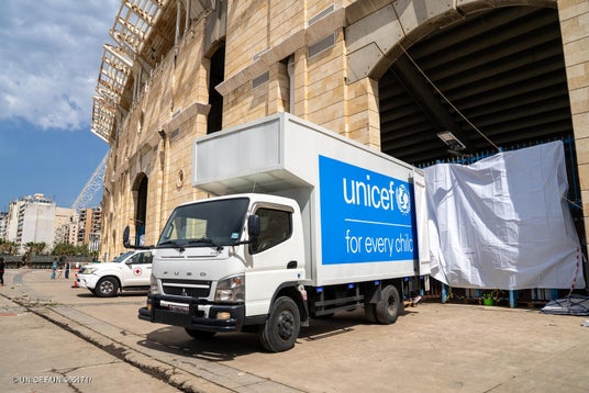 ベイルートのスポーツ施設内に新たに設置された避難所へ、支援物資を運び込むユニセフのトラック(レバノン、2026年3月18日撮影) (C) UNICEF/UNI965171/Choufany