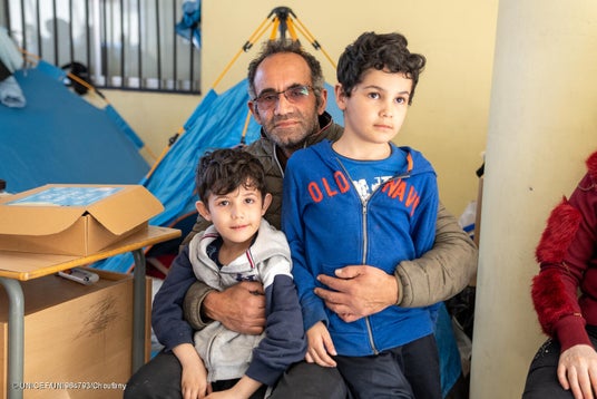 避難生活を送るベイルートの学校で、6歳のジャワードさん(左)と7歳のユーセフさん(右)を抱きしめる父親のジハードさん(中央)(レバノン、2026年3月17日撮影) (C) UNICEF/UNI964793/Choufany