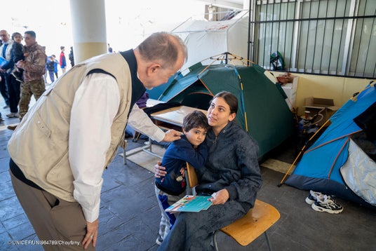 避難所となっているベイルートの学校で、避難民の家族から話を聞くユニセフのテッド・チャイバン事務局次長(レバノン、2026年3月17日撮影) (C) UNICEF/UNI964789/Choufany