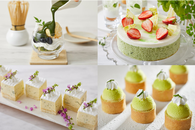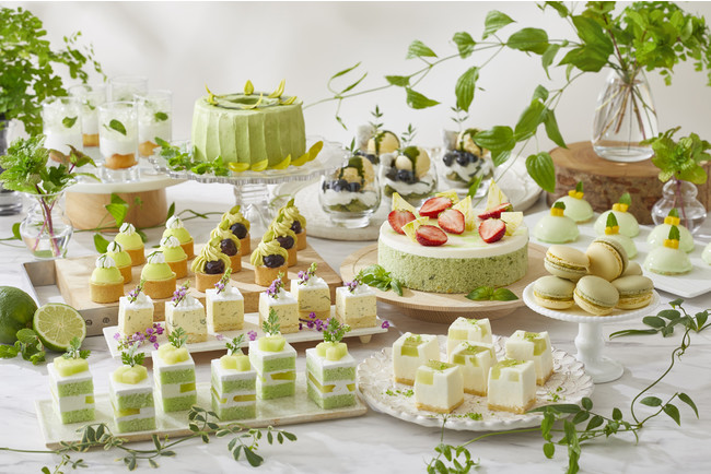 スイーツコーナーには、フレッシュバジルの風味を忍ばせたビスキュイとジュレに、ヨーグルトムースの酸味が相性抜群の「バジルフレーズとヨーグルトムース」や、甘さの奥にほんのり塩気の効いたチーズムースと爽やかな大葉が香る「大葉のレアチーズケーキ」、清々しいライムの香りと酸味が口いっぱいに広がる「ライムタルト」といった初夏にぴったりのスイーツや、濃厚なピスタチオクリームとグリオットチェリーの酸味が絶妙な「タルトスリーズピスタチオ」、パフォーマンスキッチンから提供する京都府産抹茶を使用した「抹茶パフェ」など、多彩なテイストのスイーツで新緑を感じていただけます。