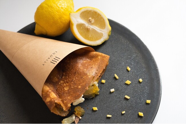 オリジナルのクレープ生地にフランス製発酵バターを塗り、国産レモンから作ったレモンコンフィチュールと「晩柑の王様」といわれる鹿児島県産のサワーポメロにクリームチーズ、ブラウンシュガーを散りばめて焼き上げました。チーズとバターのまろやかな味と香り、柑橘のさわやかな酸味、シュガーの自然な甘みとしゃりっとした食感のマリアージュをご堪能ください。
