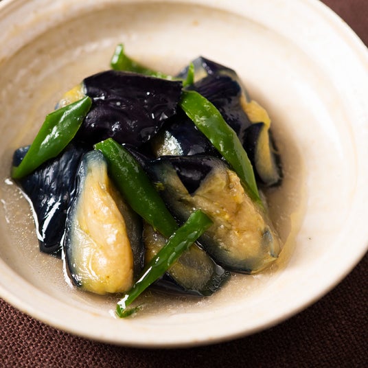 <おかず本舗 佃浅>茄子煮びたし色鮮やかな深紫色の茄子にたっぷり含まれた出汁が食欲をそそります。 シンプルだからこそまた食べたくなる、老舗和惣菜店の職人の技が活かされた一品です。
