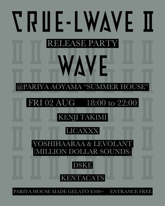 WAVEの直営店となるSOFTHYPHEN “THE HOUSE”(ソフトハイフン “ザ・ハウス“)の1F PARIYAでは8月2日(金)18:00より商品の先行発売に合わせてCRUE-LWAVEリリースパーティを開催