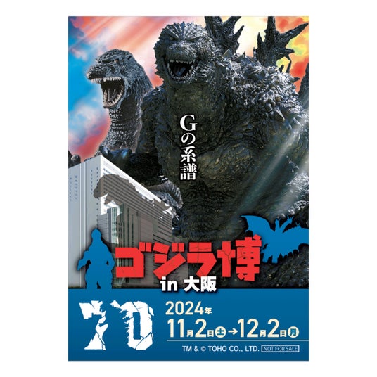 対象期間中に、13階特設会場『ゴジラ博 in 大阪』 にご入場いただき会場内グッズコーナーにて商品をお買いあげかつ5階〈ゴジラ・ストア Umeda〉にて商品をお買いあげいただいた方に先着で特製カード2枚セット(ポストカードサイズ)をプレゼントいたします。