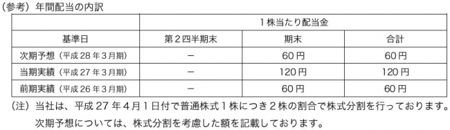 平成27年3月期の1株当たり期末配当金につきましては、上記方針に基づき総合的に検討しました結果、1株当たりの期末配当金を直近の配当予想から60円増配、120円といたしました。