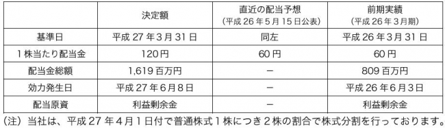 当社は、本日開催の取締役会において、平成27年3月31日を基準日とする剰余金の配当を行うことを下記のとおり決議しましたのでお知らせいたします。