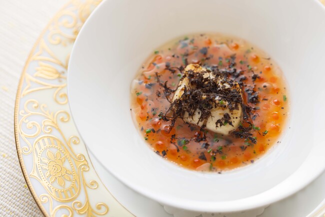 肉料理で登場する「北海道産 黒毛和牛のグリエと茹で上げアスパラガス シェリーヴィネガーソース 山わさび風味」は、上質な脂と柔らかな肉質の北海道産 黒毛和牛のステーキを、山わさびの爽やかな風味と共にお楽しみいただける一皿。フィレ肉かサーロインを、お好みでお選びいただけます。また、スープ仕立てでご用意するのは、「北海道標津(しべつ)産 鮭の白子とイクラのフラン トリュフ風味」(ディナー限定)。ふっくらとした白子とイクラのプチプチ食感、トリュフの上品な香りを一度に味わえる贅沢な逸品です。いずれも、プリフィックスコースのオプションメニューとしてご用意いたします。