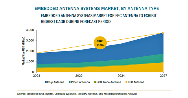 IoTデバイスや接続の増加が予想されることから、小型で信頼性が高く、低コストのデバイスを早急に開発する必要があります。ウェアラブルやトラッカーなどの多くのアプリケーションでは、外部アンテナを搭載できないため、従来の外部モノポールまたはダイポールアンテナを使用することができません。そのため、組み込み型アンテナの需要は今後数年間で成長を続けることが予想されています。