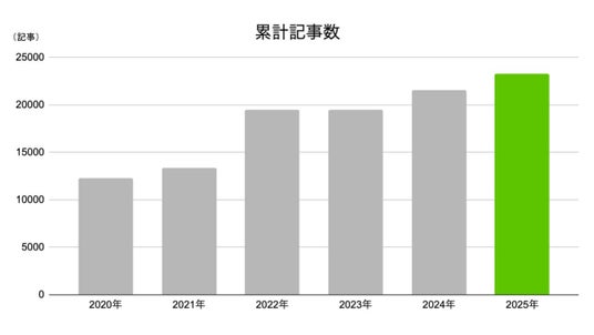 2024年・2025年と続けて20,000記事を突破し、2025年には過去最高の23,260記事を記録しました。