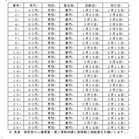 2022-02-19 東京都 新型コロナウイルスに関連した患者の死亡について Tweet ~新型コロナウイルス感染症に関する東京都からのお知らせ~ 都内で新型コロナウイルスに感染した方が死亡されましたのでお知らせします。 お亡くなりになった方のご冥福をお祈り申し上げます。 企業プレスリリース詳細へ PR TIMESトップへ 公式ツイッター Follow @Straightpress 最新情報をTwitterで受け取ろう! 公式フェイスブックページ 最新情報をFacebookで受け取ろう! 前の記事 一覧へ戻る 次の記事
