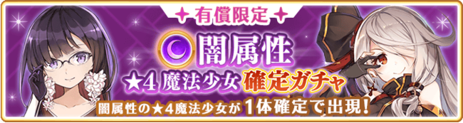 本ガチャでは、対象の闇属性★4魔法少女のうち、いずれか1体が確定で登場し有償マギアストーン150個でご利用いただけます。