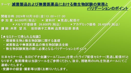 先端技術情報や市場情報を提供している(株)シーエムシー・リサーチ(千代田区神田錦町: https://cmcre.com/ )では、 各種材料・化学品などの市場動向・技術動向のセミナーや書籍発行を行っておりますが、 このたび「滅菌製品および無菌医薬品における微生物試験の実務とバリデーションのポイント」と題するセミナーを、 講師に井原 望 氏 (岩田硝子工業(株) 品質保証部 部長)をお迎えし、2024年10月18日(金)13:30より、 ZOOMを利用したライブ配信(★見逃し配信付)で開催いたします。 受講料は、 一般:44,000円(税込)、 弊社メルマガ会員:39,600円(税込)、 アカデミック価格は26,400円(税込)となっております(資料付)。