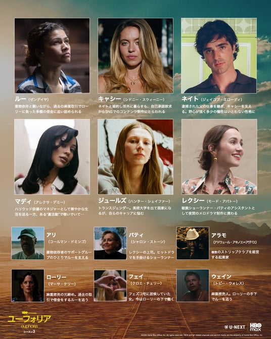 前作から約4年ぶりとなる新シーズンでは、ルーをはじめとした6名のキャラクターを中心に、大人になったそれぞれのその後が描かれます。薬物依存と闘いながら、借金に追われる生活を送るルー。美術大学を出て、画家としてのキャリアに不安を抱くジュールズ。ネイトと婚約するも、自己承認欲求からSNS中毒に陥るキャシー。逮捕された父の家業を継ぎ、野心に燃えるネイト。ハリウッド事務所で働く一方、ある“裏活動”で稼ぐマディ。敏腕ショーランナーのアシスタントとして、ドラマ制作に携わるレクシー。高校を卒業し、誰も守ってくれない危険な世界に足を踏み入れた彼らの、これまで以上に過激な毎日のなか、“生きる意味(ユーフォリア)”を求めもがく姿に注目です。