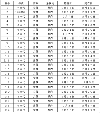 都内で新型コロナウイルスに感染した方が死亡されましたのでお知らせします。
