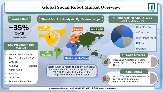 世界のソーシャルロボット市場は、2022-2030年の予測期間中にCAGRが約35%で成長すると推定されています。