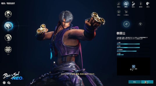 ゲームプレイに先立ち『ブレイドアンドソウルNEO』運営プロデューサーの福富(以下、福富)から、4つの種族(ジン族・ゴン族・リン族・クン族)の特徴を説明、福富より「現在ゲーム内では、筋肉質のキャラは実はあまりいなくて、かわいい女の子か男の子、奇麗な女性キャラが多いんですよ。是非及川氏には、ボディビルダー目線で筋肉質のかっこいいキャラクターを作って欲しいです。」といったオーダーを受け、まずは一番体格が大きいゴン族でのキャラクタークリエイトに挑戦しました。