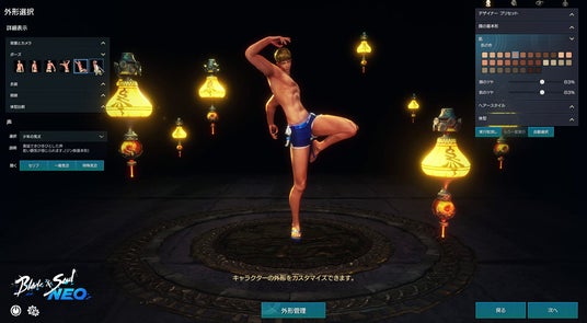 元々「ブレイドアンドソウル」では、9999兆通りのキャラクタークリエイトが可能でしたが、「ブレソネオ」では、ヘアスタイルや選べるパーツが増えたほか、スライドバーで調節できる幅が広がるなど、さらに選択の幅が増えており、今回及川氏が理想とするからだ作りをゲーム内で再現するには、うってつけのリメイクとなりました。