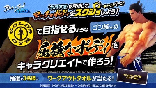 「ブレイドアンドソウル」公式X(旧Twitter)アカウント( https://x.com/bns_official_jp )をフォローして、ゴールドジムで目指せるような屈強なボディを持つゴン族(男)のスクリーンショットを指定ハッシュタグ「 #ゴールドジムでゴン男 」をつけてXでポストした方の中から、抽選で3名様に「ゴールドジム」ワークアウトタオルをプレゼントします。