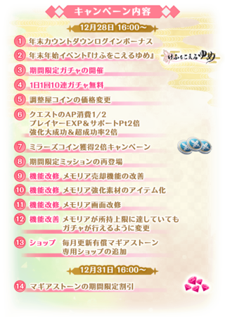 また、『お正月キャンペーン』は第2弾も予定しております。第2弾の告知は12月31日16:00を予定しております。