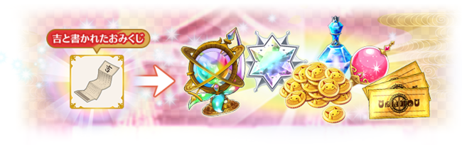 「けふをこえるゆめ おみくじ交換所」では「ガチャチケット」や「デスティニーボトル」等をランダムで獲得することができます。