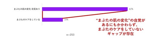 まぶたの変化の自覚がある一方で、まぶたケアの実践者がたった1割程度に留まる事実