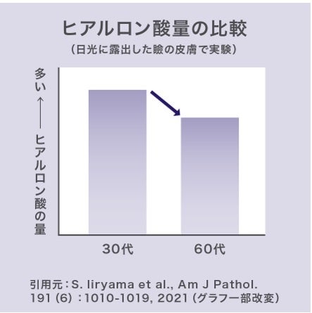ヒアルロン酸は水を抱える能力の高い保湿成分ですが、加齢と共にヒアルロン酸量は減少していき、まぶたの皮ふでもヒアルロン酸が減少していくことが確認されています。