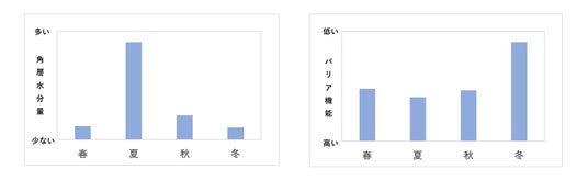 肌の角層水分量は夏から秋にかけて急激に少なくなり、冬になると肌のバリア機能は最も低下します。