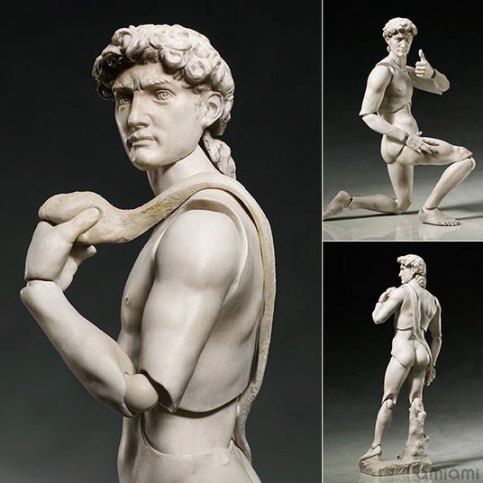 『ダビデ』ポーズを再現する為の専用台座や手首パーツ、実際に石を投げるポーズがとれる「投石器」や、その他手首パーツが付属。あみあみにて予約受付中。
