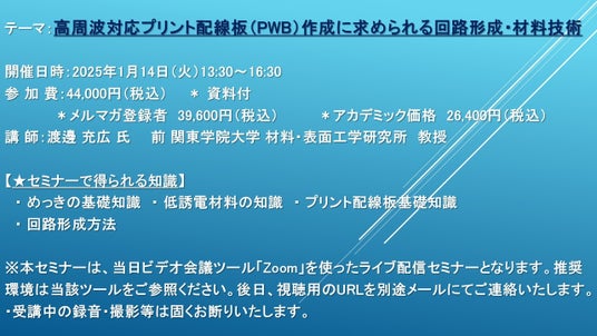 先端技術情報や市場情報を提供している(株)シーエムシー・リサーチ(千代田区神田錦町: https://cmcre.com/ )では、 各種材料・化学品などの市場動向・技術動向のセミナーや書籍発行を行っておりますが、 このたび「高周波対応プリント配線板(PWB)作成に求められる回路形成・材料技術」と題するセミナーを、 講師に渡邊 充広 氏 (前 関東学院大学 材料・表面工学研究所 教授)をお迎えし、2025年1月14日(火)13:30より、 ZOOMを利用したライブ配信で開催いたします。 受講料は、 一般:44,000円(税込)、 弊社メルマガ会員:39,600円(税込)、 アカデミック価格は26,400円(税込)となっております(資料付)。