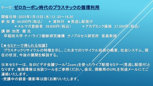 先端技術情報や市場情報を提供している(株)シーエムシー・リサーチ(千代田区神田錦町: https://cmcre.com/ )では、 各種材料・化学品などの市場動向・技術動向のセミナーや書籍発行を行っておりますが、 このたび「ゼロカーボン時代のプラスチックの循環利用」と題するセミナーを、 講師に加茂 徹 氏 (早稲田大学 ナノ・ライフ創新研究機構 ナノプロセス研究所 客員教授)をお迎えし、2025年1月15日(水)13:30より、 ZOOMを利用したライブ配信(見逃し配信付き)で開催いたします。 受講料は、 一般:44,000円(税込)、 弊社メルマガ会員:39,600円(税込)、 アカデミック価格は27,500円(税込)となっております(資料付)。