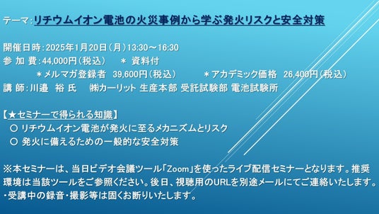先端技術情報や市場情報を提供している(株)シーエムシー・リサーチ(千代田区神田錦町: https://cmcre.com/ )では、 各種材料・化学品などの市場動向・技術動向のセミナーや書籍発行を行っておりますが、 このたび「リチウムイオン電池の火災事例から学ぶ発火リスクと安全対策」と題するセミナーを、 講師に川邉 裕 氏 ((株)カーリット 生産本部 受託試験部 電池試験所)をお迎えし、2025年1月20日(月)13:30より、 ZOOMを利用したライブ配信で開催いたします。 受講料は、 一般:44,000円(税込)、 弊社メルマガ会員:39,600円(税込)、 アカデミック価格は26,400円(税込)となっております(資料付)。