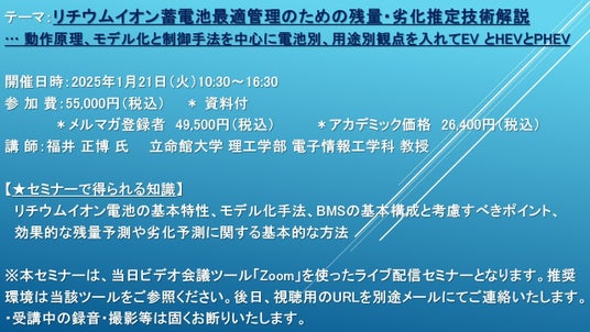 先端技術情報や市場情報を提供している(株)シーエムシー・リサーチ(千代田区神田錦町: https://cmcre.com/ )では、 各種材料・化学品などの市場動向・技術動向のセミナーや書籍発行を行っておりますが、 このたび「リチウムイオン蓄電池最適管理のための残量・劣化推定技術解説 … 動作原理、モデル化と制御手法を中心に電池別、用途別観点を入れてEV とHEVとPHEV」と題するセミナーを、 講師に福井 正博 氏 (立命館大学 理工学部 電子情報工学科 教授)をお迎えし、2025年1月21日(火)10:30より、 ZOOMを利用したライブ配信で開催いたします。 受講料は、 一般:55,000円(税込)、 弊社メルマガ会員:49,500円(税込)、 アカデミック価格は26,400円(税込)となっております(資料付)。