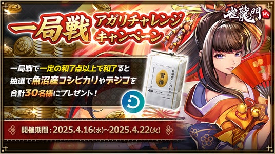 エヌ・シー・ジャパン株式会社(本社:東京都港区、代表取締役:林 元基(イム ウォンキ)、以下エヌシージャパン)は、PCとスマートフォン向け超美麗本格3D麻雀ゲーム『雀龍門M』にて、4月16日(水)より「一局戦アガリチャレンジキャンペーン」の開催をお知らせします。