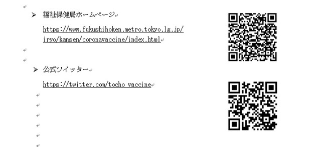 ワクチン接種会場の最新情報等は、福祉保健局ホームページ及び公式ツイッター「東京都設置 ワクチン大規模接種会場」でご確認下さい。